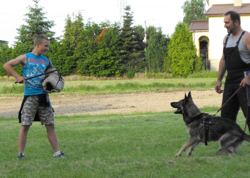Tak jak każdego roku zostaliśmy zaproszeni na pokaz tresury psów Szkoły Red Dog w Kaliszu. Ponieważ wszyscy z nas uwielbiają zwierzęta, pojechaliśmy tam z wielką ochotą. Pan Rafał i jego dwa owczarki niemieckie przygotowali dla nas wspaniały pokaz! Byliśmy pod wielkim wrażeniem jak psiaki reagowały na wszystkie komendy, wykonywały różne ćwiczenia i w ogóle nie przeszkadzały im nasze okrzyki zachwytu. Nawet nasz Piotrek uczestniczył w zadaniu w roli pozoranta, ale wcale się nie bał atakującego go psa. A to wcale nie była jedyna atrakcja tego dnia! Pani Dorota zorganizowała dla nas słodki poczęstunek, ognisko, przy którym piekliśmy kiełbaski, różne gry i zabawy (także na dmuchanym zamku do skakania), mecze piłki nożnej, malowanie twarzy dla najmłodszych. Jak zwykle przy naszych wizytach na Winiarach bawiliśmy się fantastycznie! Wracaliśmy do domu pełni wrażeń i kolejnych wspaniałych wspomnień. Nie możemy się już doczekać naszego kolejnego spotkania z psiakami, za które serdecznie dziękujemy państwu Dorocie i Rafałowi!